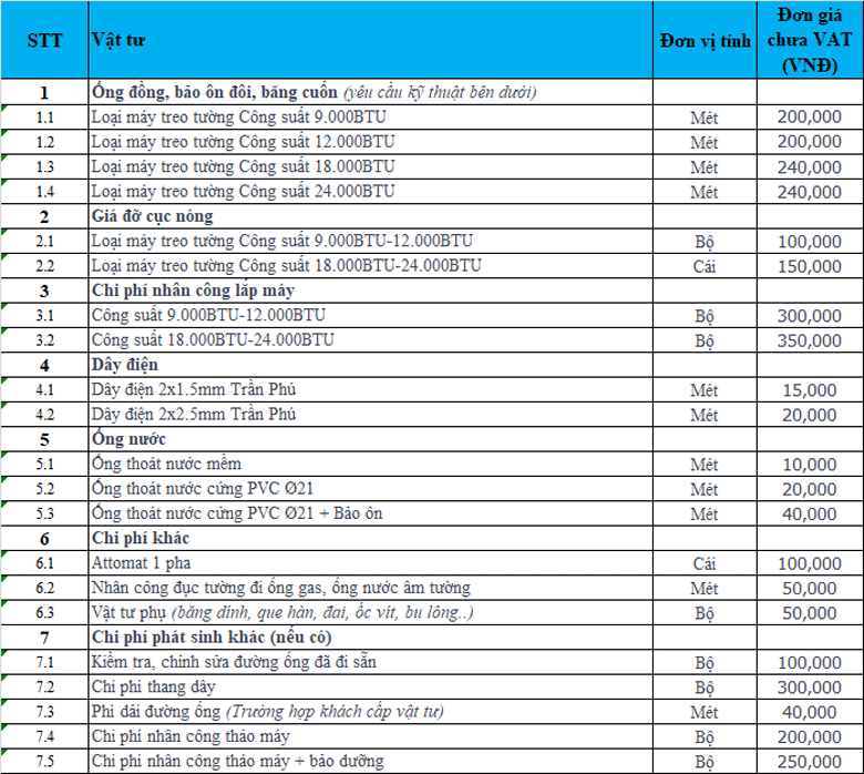 - Giá nhân công, vật tư lắp đặt trên chưa bao gồm thuế VAT 10%.