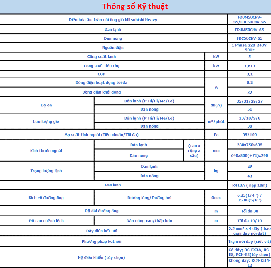 Thông số kỹ thuật điều hòa âm trần nối ống gió Mitsubishi Heavy FDUM50CNV: