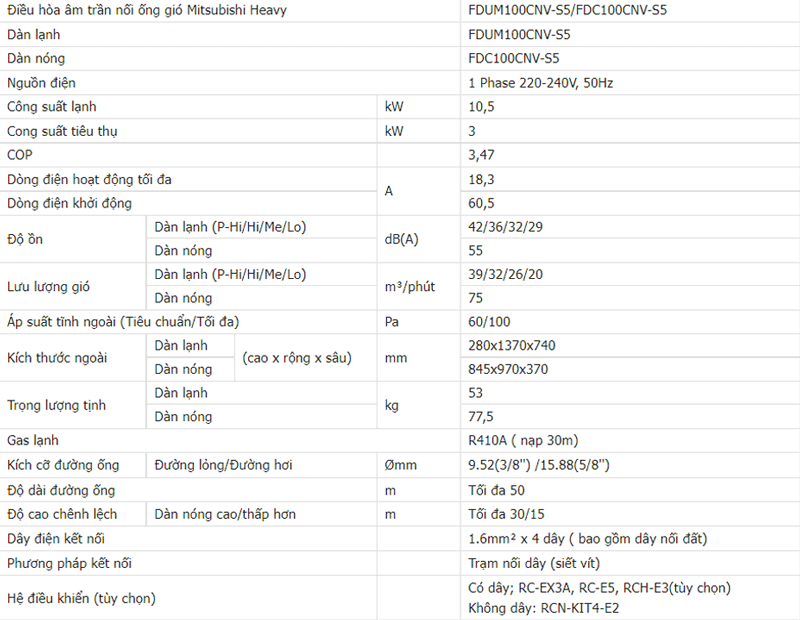 Thông số kỹ thuật điều hòa âm trần nối ống gió Mitsubishi Heavy FDUM71CNV-S5/FDC71CNV-S5 1 chiều cơ: