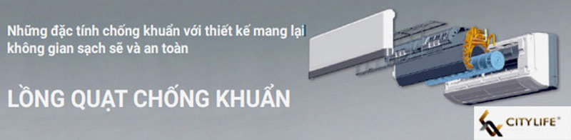 - Lồng quạt của điều hòa Mitsubishi Heavy đã được xử lý kháng khuẩn, đánh bay những nấm mốc bám trên lồng quạt từ đó xua tan những mầm bệnh tạo ra một môi trường sạch sẽ và an toàn cho người tiêu dùng.